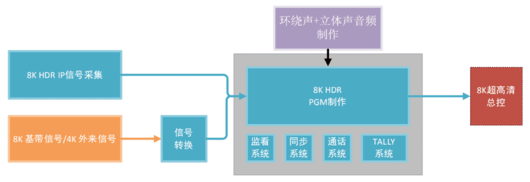 台内8K超高清电视信号业务制播单元为全8K HIDR的制播环境,包括8K超高清电视直播演播室、8K超高清电视外场转播系统、8K超高清电视播出系统、8K超高清电视收录系统。